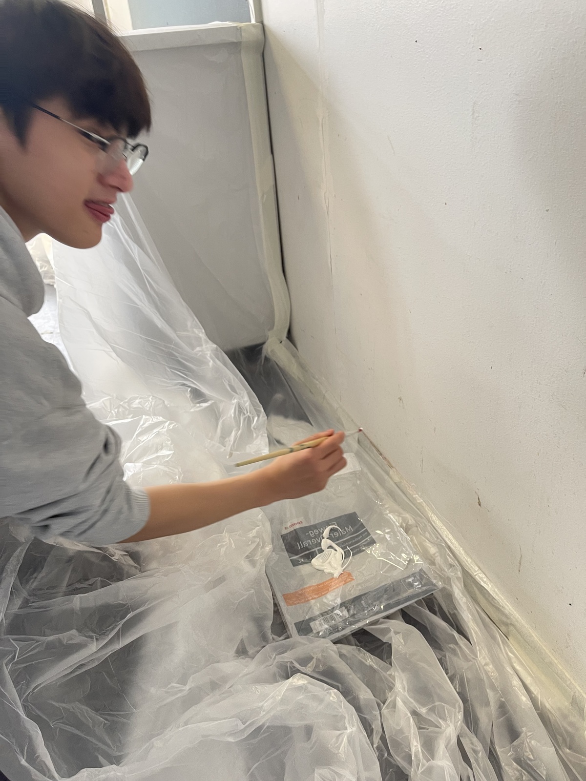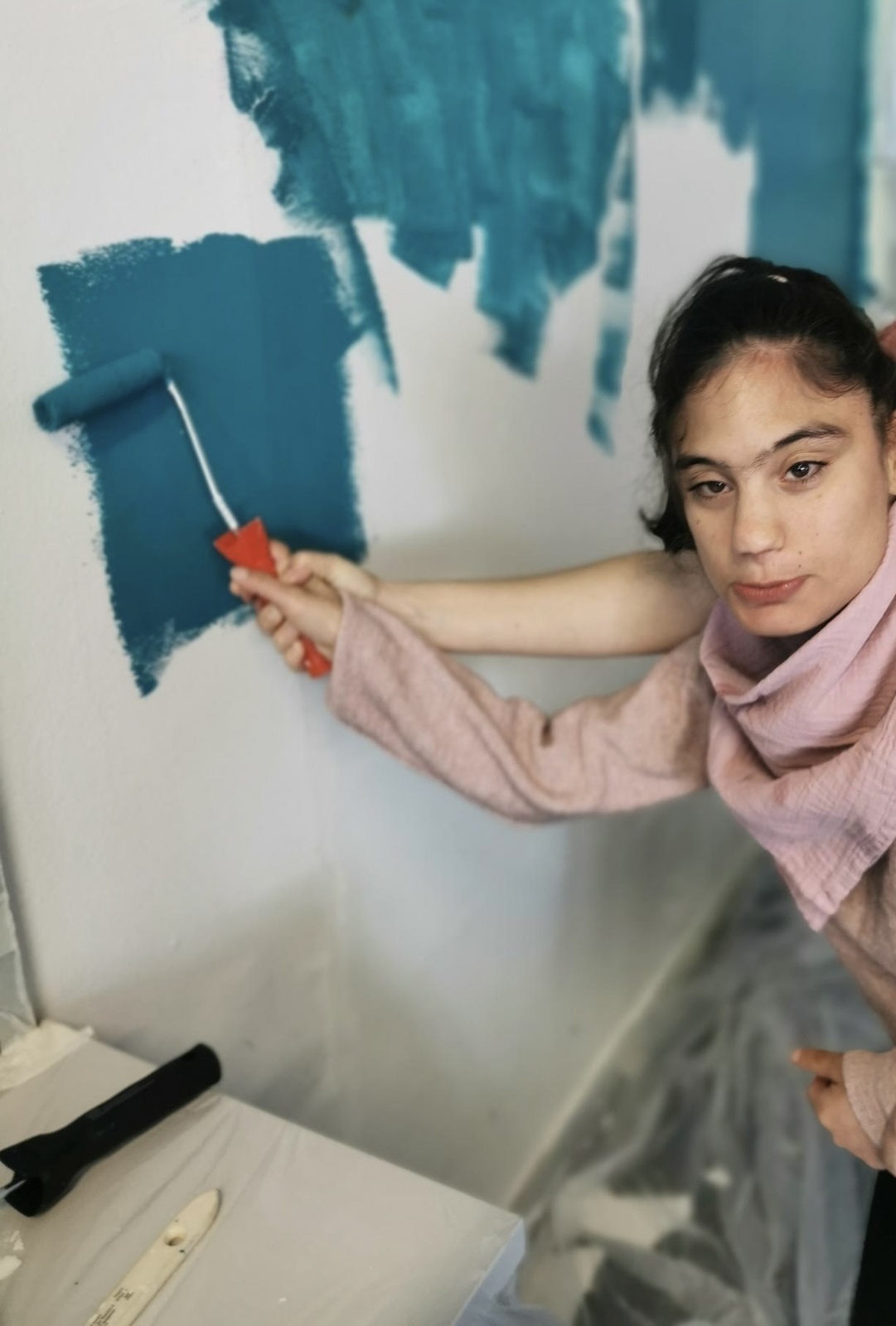 Die Türrahmen und die Fußleisten wurden abgeklebt, die Löcher und Risse zugespachtelt. Dann haben wir angefangen, zu streichen. Das hat Spaß gemacht.